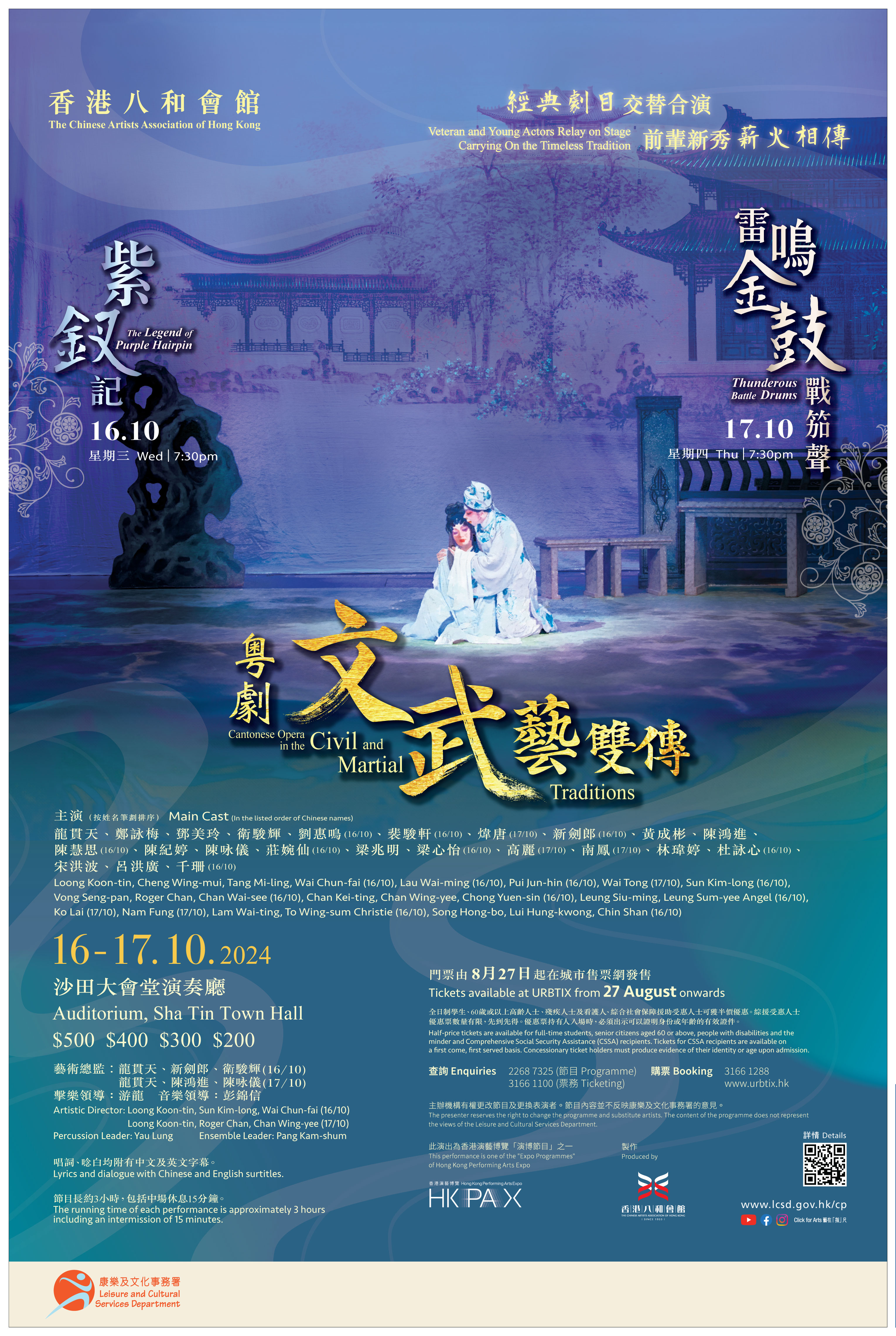 香港八和會館選演一文一武足本經典長劇《紫釵記》、《雷鳴金鼓戰笳聲》,六柱由老倌及年輕演員交替接棒演出,展示本地粤劇新一代的實力。以舊帶新,老倌將寶貴演出經驗帶給新一代演員,標誌本土粤劇藝術的薪火相傳。