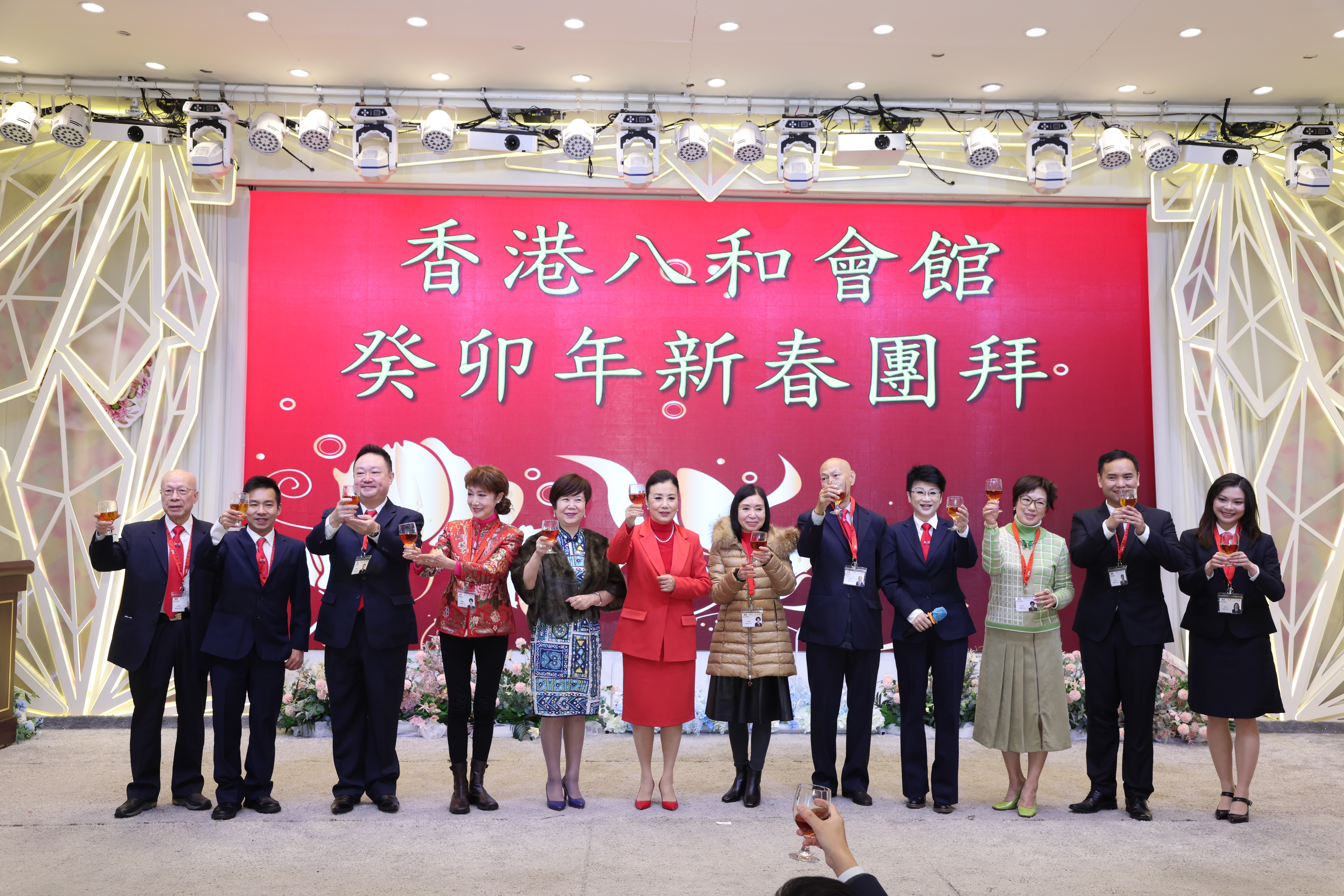 主席汪明荃博士聯同一眾理事於台上向來賓祝酒,並由高潤鴻理事向一眾賓客派發利是,祝願各位新一年福氣滿載、兔年如意。