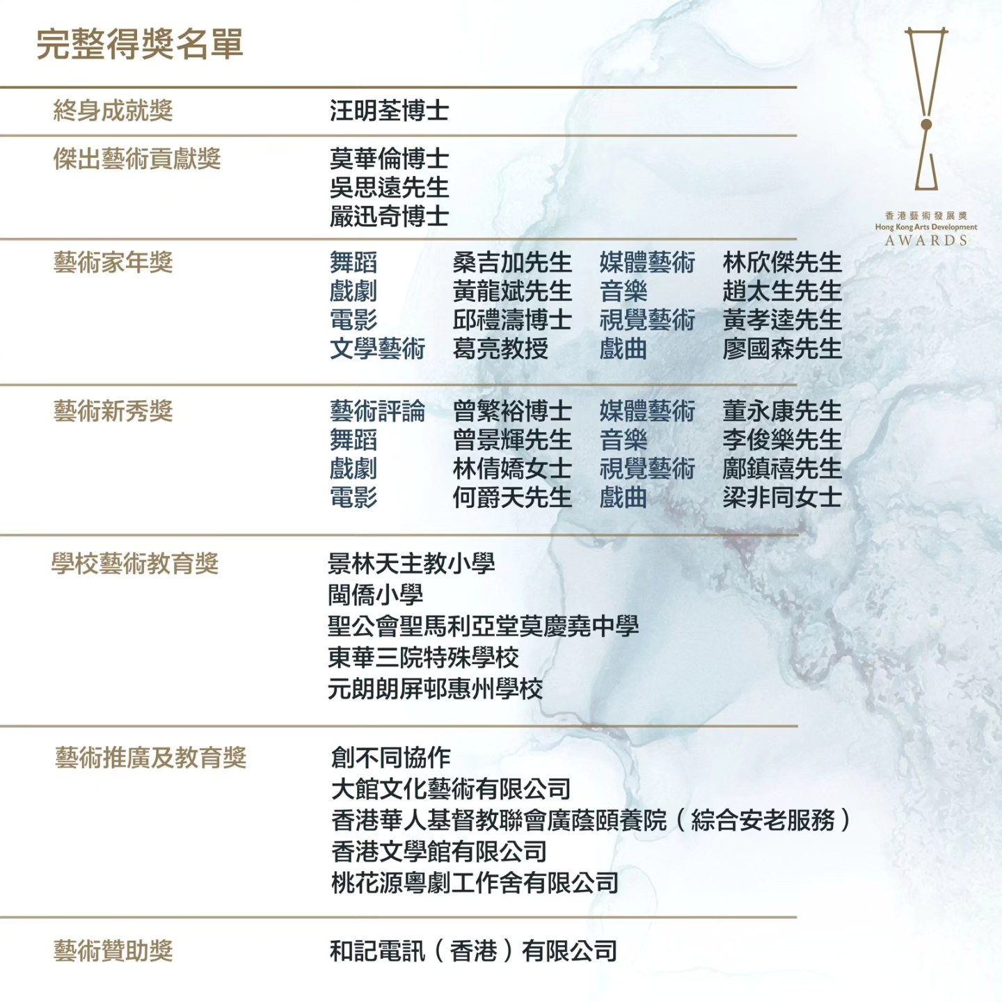 恭賀汪明荃博士、廖國森先生、梁非同小姐於「香港藝術發展獎頒獎禮」同獲殊榮
