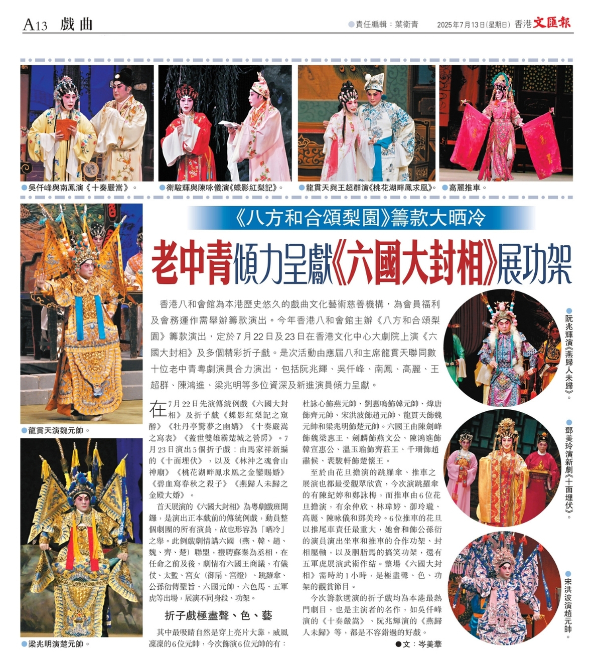 感謝 #香港文匯報(撰文:岑美華) 報導,香港八和會館將於7月22至23日在香港文化中心舉辦《八方和合頌梨園》籌款演出,由龍貫天、阮兆輝、吳仟峰、南鳳等數十位老倌新進傾力演出。