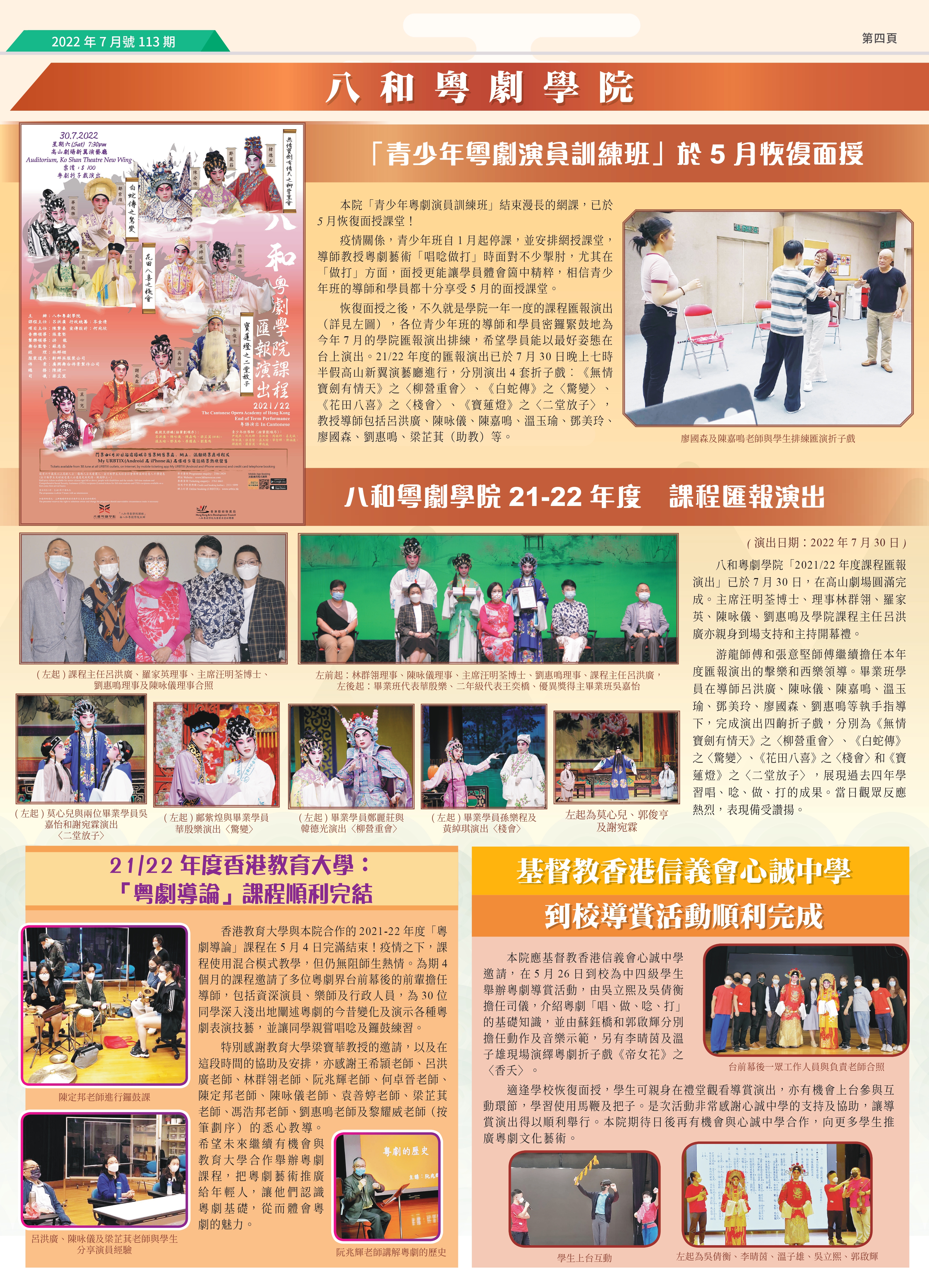 「青少年粵劇演員訓練班」於5 月恢復面授;八和粵劇學院21-22 年度 課程匯報演出;21/22 年度香港教育大學: 「粵劇導論」課程順利完結;基督教香港信義會心誠中學 到校導賞活動順利完成