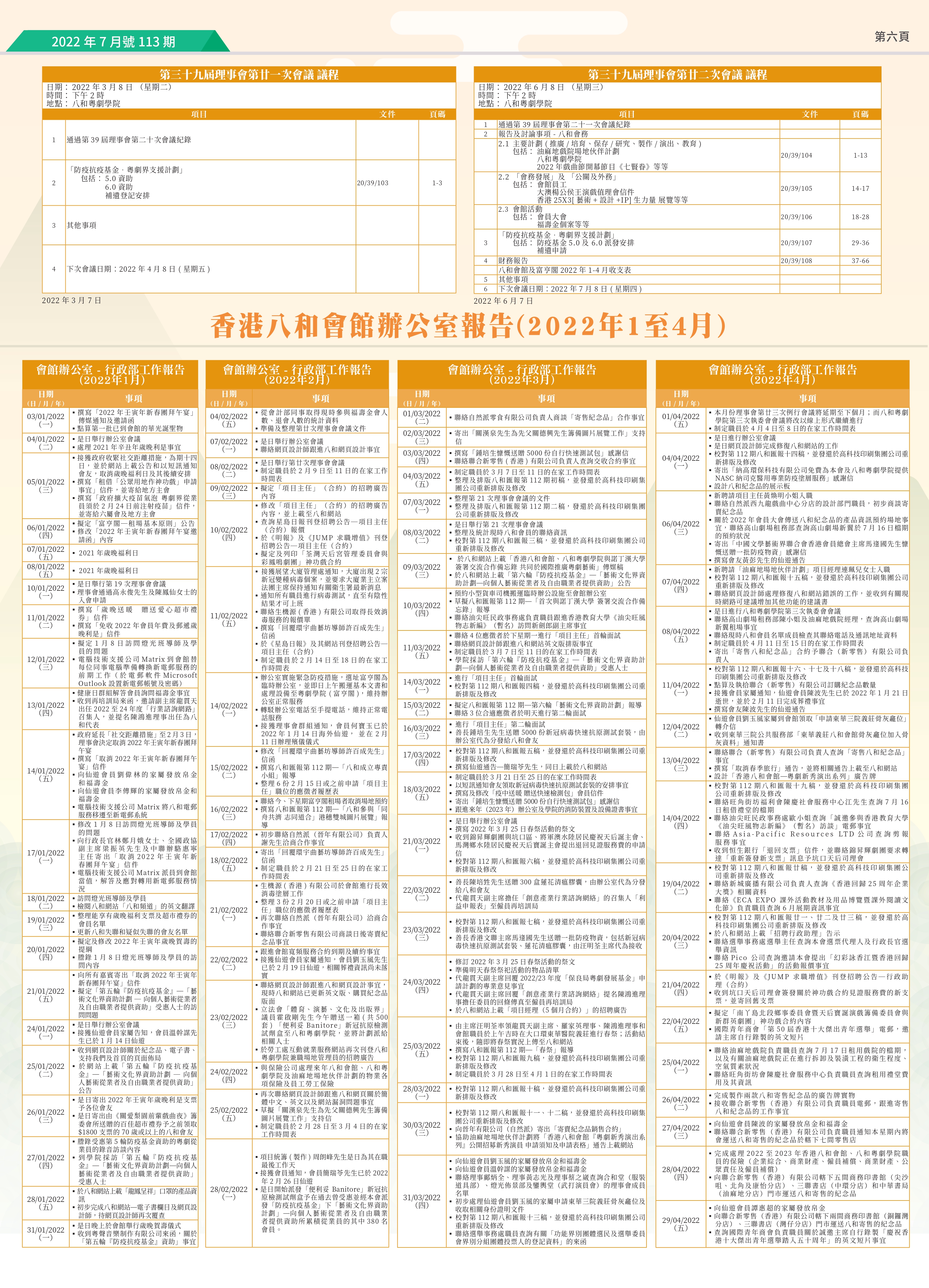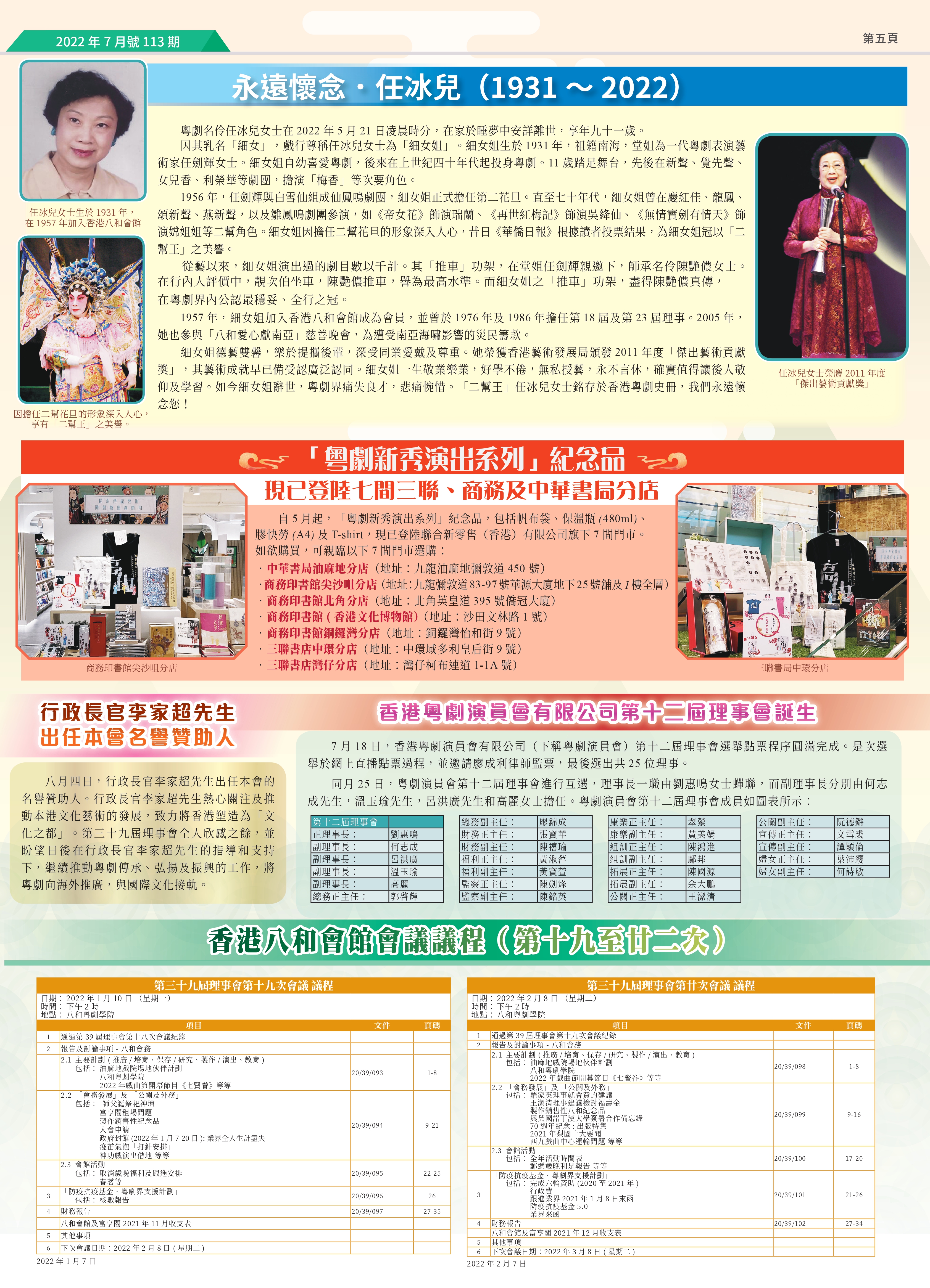 永遠懷念.任冰兒(1931 ~ 2022);「粵劇新秀演出系列」紀念品;行政長官李家超先生 出任本會名譽贊助人;香港粵劇演員會有限公司第十二屆理事會誕生;香港八和會館會議議程(第十九至廿二次)