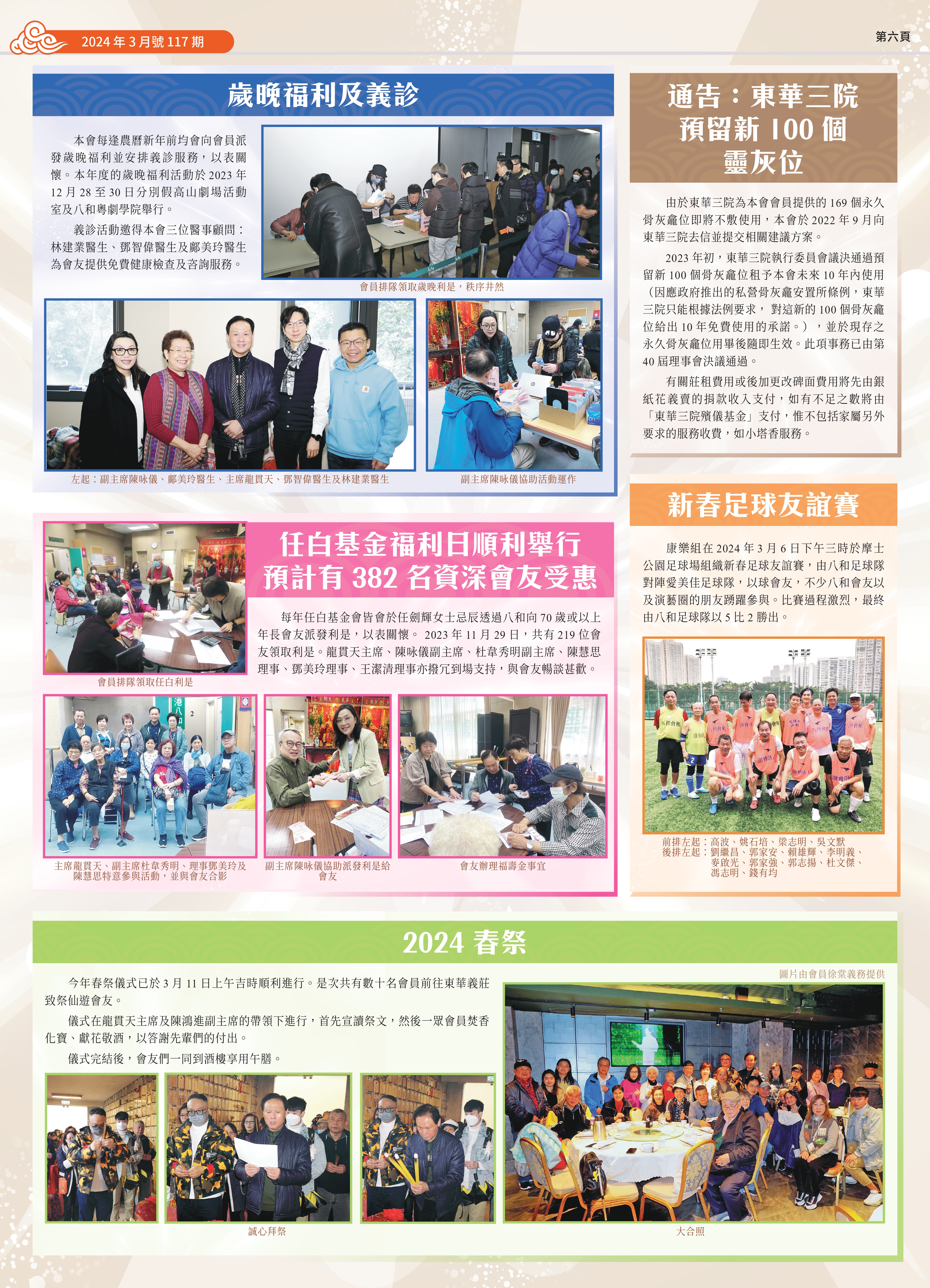 歲晚福利及義診;通告:東華三院 預留新100 個 靈灰位;任白基金福利日順利舉行 預計有382 名資深會友受惠;新春足球友誼賽;2024 春祭