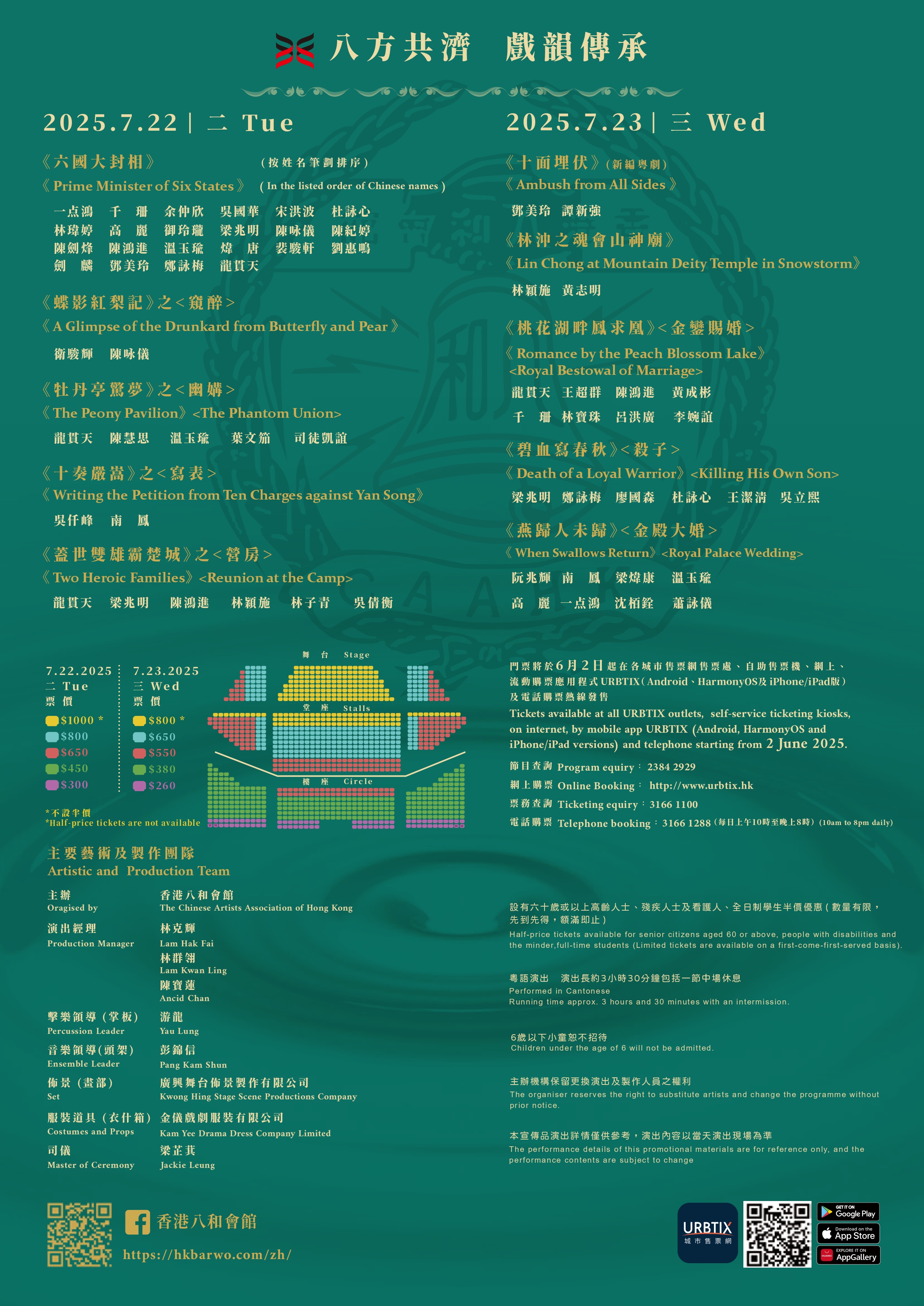 香港八和會館謹定於2025年7月22日及23日,假香港文化中心舉行籌款演出《八方和合頌梨園》,呈獻經典例戲《六國大封相》及多齣精彩折子戲。